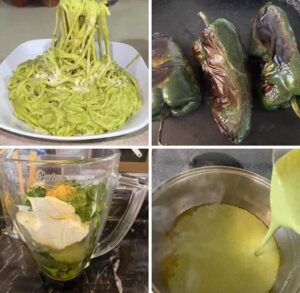 Cortamos en pequeños trozos el chile y los agregamos a la licuadora junto con la leche, la crema, el trozo de cebolla, ajo y el cilandro. Entonces, procedemos a licuar y formamos nuestra salsa de cilantro para el plato de espagueti verde que estamos preparando. Una vez lista reservamos un momento.
