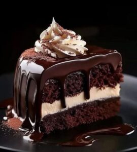 Delicioso pastel de chocolate en capas, relleno de caramelo cremoso, cubierto con un delicioso ganache, almendras crujientes y coco rallado.